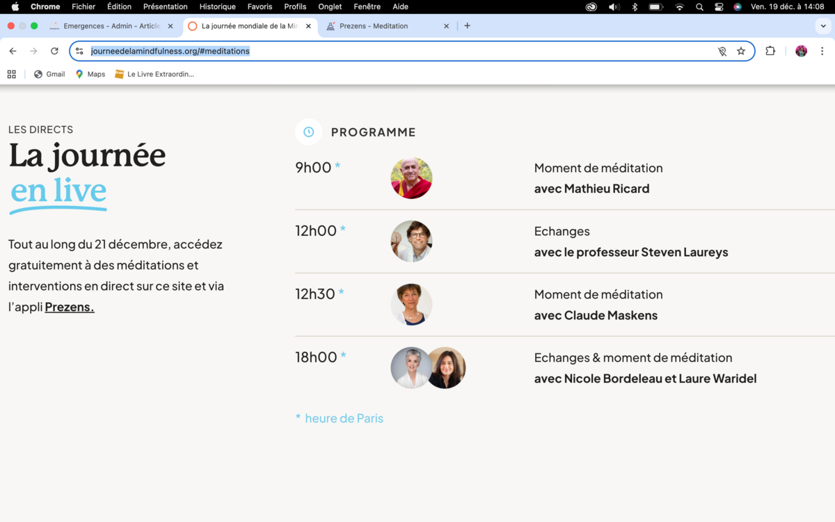 Outre ces nombreuses activités et les méditations en ligne proposées chaque jour par des instructeur·ices certifié·es sur notre site dédié ou sur notre app de méditation solidaire Prezens, vous pourrez suivre gratuitement les 4 temps forts de la Journée du 21 décembre en live avec au programme :